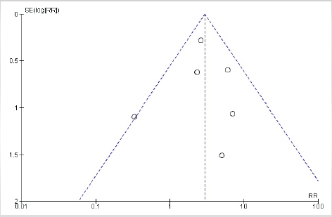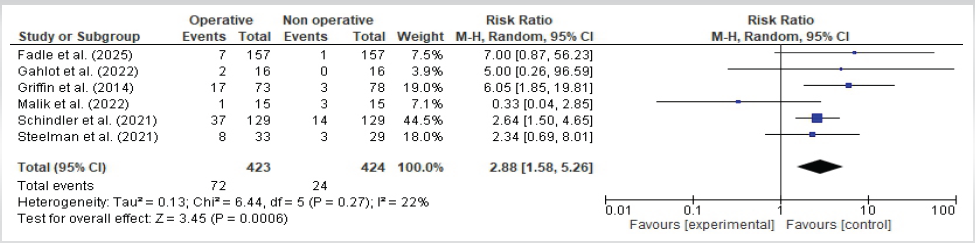 Six studies reported complications, and were eligible for meta-analysis (Fig. 4 and 5). They reported no significant difference in complications between operative and non-operative (relative risk [RR]: 2.88 [95% CI 1.58–5.26]). Heterogeneity among these studies was high (Tau2 = 0.13; Chi2 = 6.44; df = 5 [P = 0.27>0.05]; I2 = 22%).