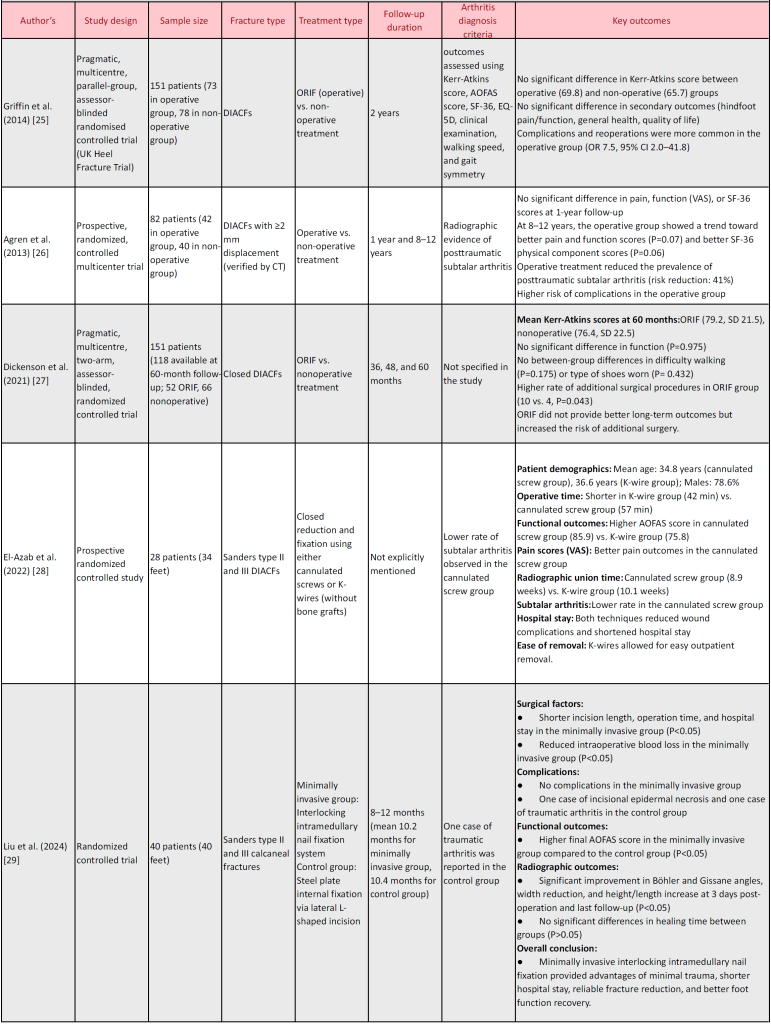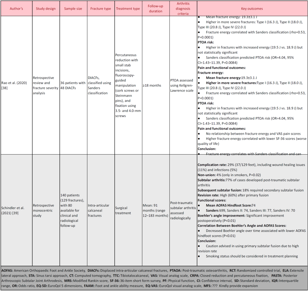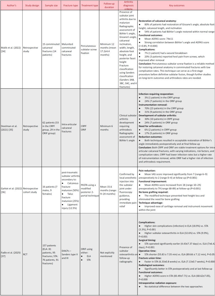 Studies of PTA after calcaneal fractures, RCTs, cohort studies, case–control studies, and retrospective observational studies, Comparative studies of surgical vs. non-surgical intervention and their influence on the development of arthritis, at least 12-month follow-up to determine long-term outcomes, trials reporting at least one functional, radiographic, or clinical outcome, incidence of PTA and articles published in English were included in the study.