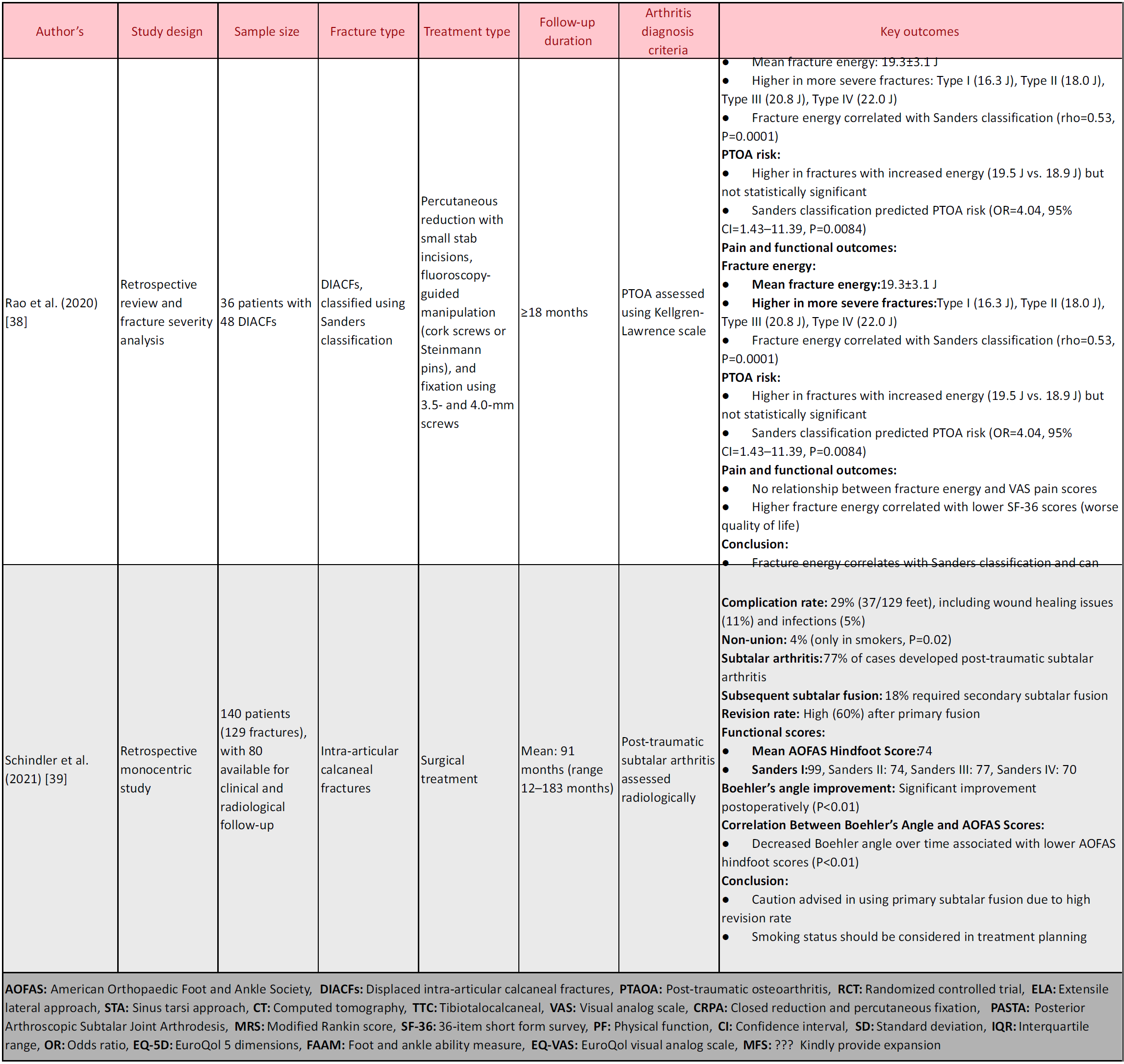 Studies of PTA after calcaneal fractures, RCTs, cohort studies, case–control studies, and retrospective observational studies, Comparative studies of surgical vs. non-surgical intervention and their influence on the development of arthritis, at least 12-month follow-up to determine long-term outcomes, trials reporting at least one functional, radiographic, or clinical outcome, incidence of PTA and articles published in English were included in the study.