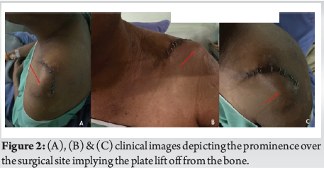 In the immediate post-operative period, the patient remained stable and was advised strict shoulder immobilization. However, by post-operative day five, he reported renewed pain over the same region and noticed a palpable bump over the clavicle (Fig. 2). Repeat radiographs revealed implant failure due to plate lift-off. The patient was then scheduled for a revision surgery. During the second procedure, the failed plate was removed and replaced with a 4-hole locking clavicle hook plate to provide better fixation and two-plane stability. The post-operative course was uneventful and the patient was gradually started on a guarded physiotherapy regimen (Fig. 3). No further complications or implant issues were reported, although the patient was subsequently lost to follow-up.