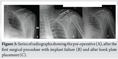 In our case, fixation was initially attempted using a pre-contoured anatomical locking plate. However, due to insufficient purchase on the small distal fragment, the construct failed, resulting in plate lift-off and implant prominence. Given the instability and fracture morphology, conversion to a hook plate was performed, providing the necessary fixation and acromio-clavicular joint support. This case underscores the importance of meticulous pre-operative planning and appropriate implant selection tailored to the specific fracture characteristics and patient needs.